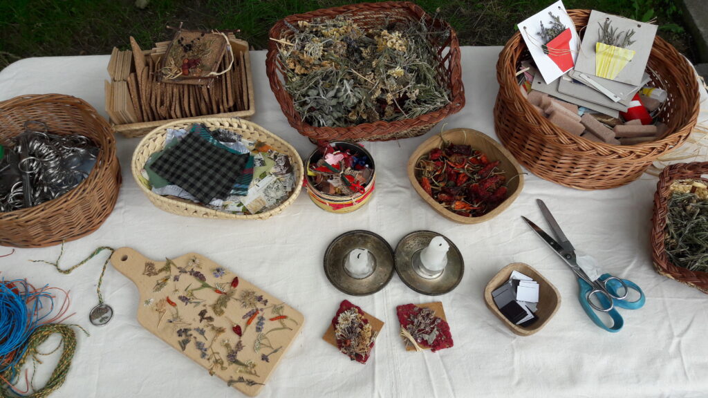 A „Kreatív sarok”-ban mindenki elkészítheti a neki tetsző emléket (gyógynövényes hűtőmágnes, füvesasszony textilből, fonalbaba levendula szoknyában).